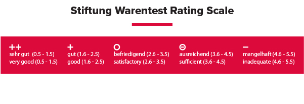 Im besonders wichtigen Bereich „SICHERHEIT“ erhielt das Modell FF ebenfalls die Bewertung „GUT“ (2,2). Hervorgehoben wurden dabei das sichere Gurtsystem, die stabile Sitzbefestigung, die Verringerung des Verletzungsrisikos, die Sichtbarkeit bei Dunkelheit sowie deutliche Warnhinweise.